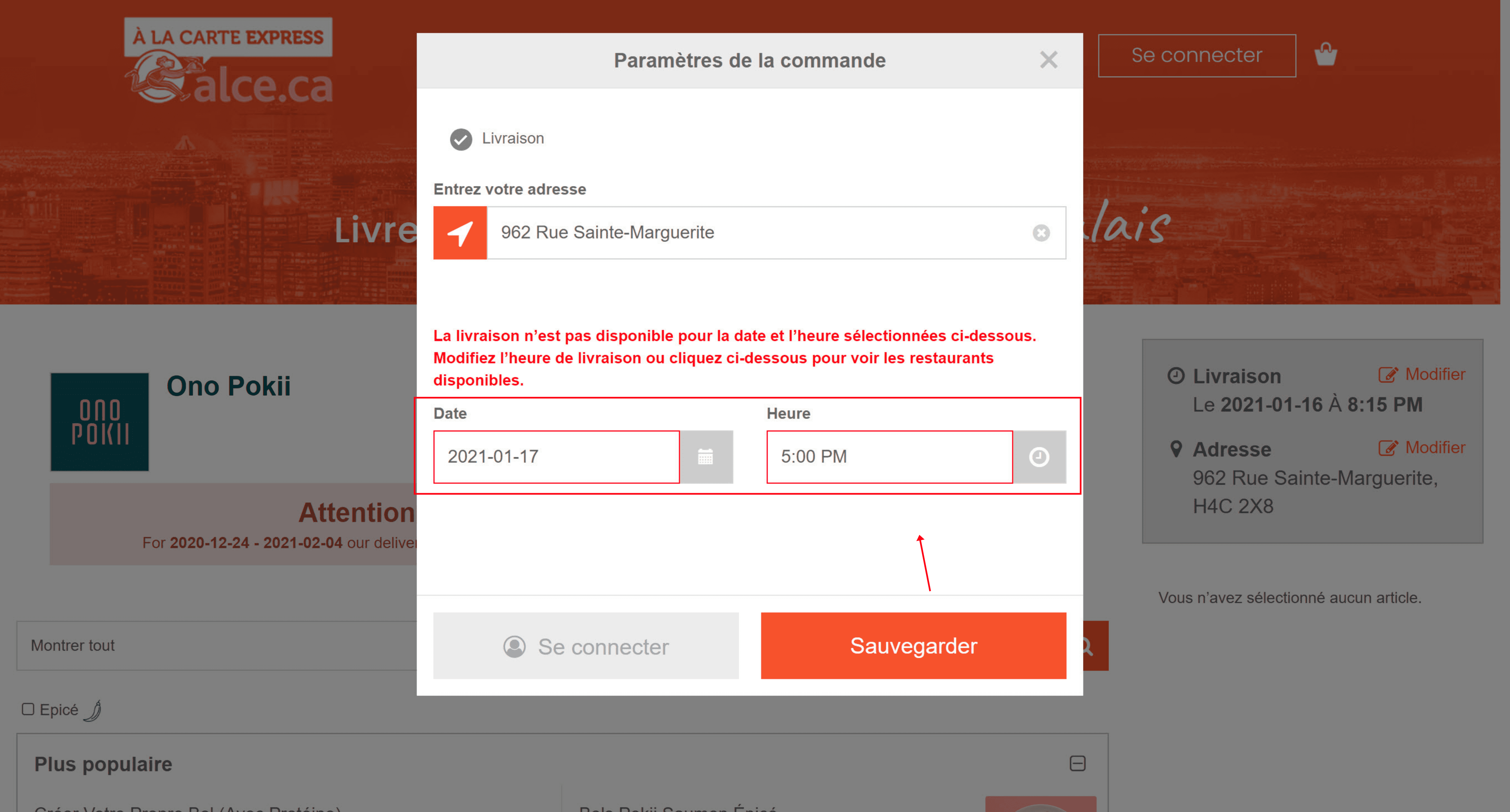 Recommendation: Shade or remove the date and time that is unavailable to order, this will prevent users from clicking an incorrect time and an error message. Only show dates and time that users can pick.